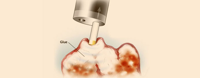 Glue injection, also known as endoscopic cyanoacrylate injection, is a medical procedure used primarily to treat gastric varices, which are enlarged veins in the stomach that can bleed, commonly associated with conditions such as liver cirrhosis and portal hypertension. During the procedure, an endoscope, a flexible tube with a camera and light, is inserted through the mouth and guided into the stomach. Once the varices are identified, a medical adhesive (typically a type of cyanoacrylate glue) is injected directly into the varices using a specialized needle passed through the endoscope. The glue rapidly hardens upon contact with blood, effectively sealing the varices and stopping or preventing bleeding.